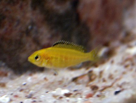 Here is a pic of a month old Electric Yellow fry in the "grown-up" tank I just took. Its a tad blurry cuz it kept running for cover, but it shows their true colors! I have a different light spectrum in my big tank that makes the fishes colors just pop out! I need to get one for my fry tank too, because they all look so washed out. Ain't he just the cutest thing??? Brave little bugger too, I am keeping this one for sure!