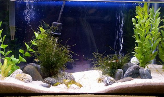 #3 is the set up I have for them in a 10 gallon. Make sure you add a little pile of rock for them to hang out in :-) I changed the sand. I had black and changed to white because you can see their colors better. I have Java Moss clumps on the rock piles, they munch food out of it all day long.