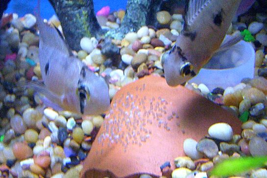 That pic is their second successful spawn. They dug a pit for the wigglers in the rock, but the rock was so big the wigglers wiggled deep in and the Rams could not get to them. Rams are not very good diggers. I even stuck a little plastic cup thingy in there for them to use as a pit. They have not spawned since I switched to sand :-/
