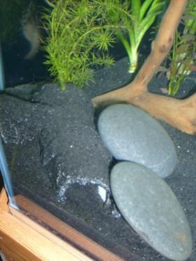 OK, my Africans are too big now for the rock caves I make with my small river rock. They are fighting over about 4 caves now. *sigh* I don't want to add bigger rocks, thus more weight, so I bought a 2" wide piece of black PVC pipe the other day. I cut it into 12 pieces that are now 5" long by 2" wide. I added a couple to see if they like them and they do! So the plan is to lay them side by side on the bottom and then cover them with my river rocks so they are not as noticeable. Problem? How can I keep them from floating?? I had to wedge the one I put in there (the trial one) to keep it from floating up. Any ideas? I glued a small stone to the bottom, but it wasn't heavy enough.