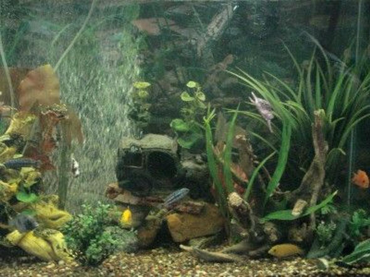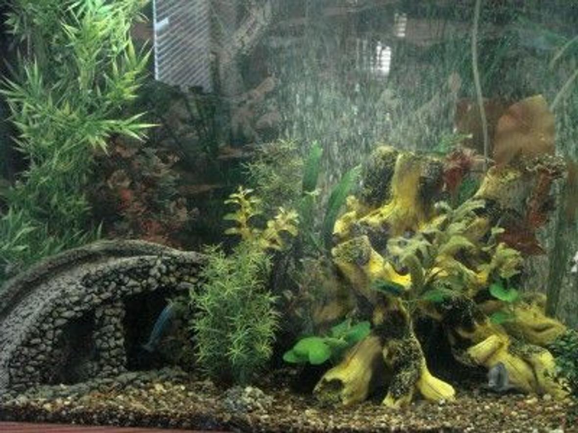 The details of the tank are lost we have had everything for so long. We have two canister filters, river rocks, wood and many fake plants.