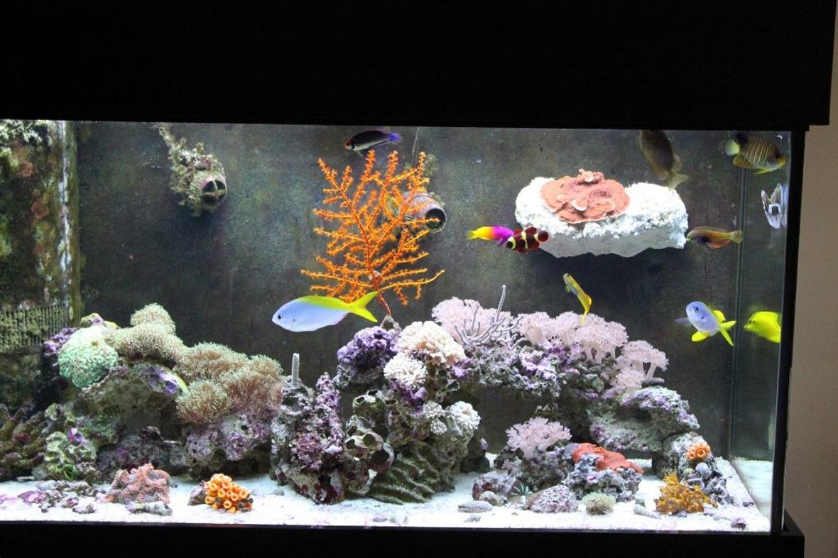 Royal Gramma, Regal Angelfish, Purple Firefish, Yellow Tang, Gold Spotted Rabbitfish, Midas Blenny, Scott's Fairy Wrasse, Blue Star Leopard Wrasse,2 blue and yellow fusilers, and gold stripe Maroon clownfish