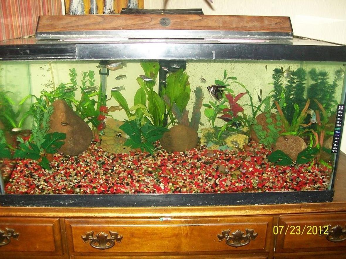 very basic set up alot of it i got used or made my self like some of thhe plants and the background (just painted the outside back of the tank) i have 3 angels 5 corys 5 glowlight tetras 5 black tetras 5 bleeding hart tetras 6 st rasboras 6longfindanos 1pearl gurami 1blue paradise 1chinese algie eater and 1 cardinal tetra (got with the glow lights )sounds like a lot of fish however tetras give very little waste so i go by a 1 inch 2 1 half gal with them (not advise just how i do it) and bottum feeders i dont take into my fish count because themywork for you in the tank and are very helpful