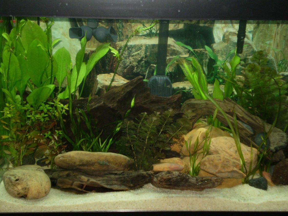 125 gallon freshwater fish tank. Recently changed the substrate from sand to river rock. Have over 70 misc. fish including (Tetra's, Mollies, Pleco's, Gouriamis, and a lot of snails. One FX5 filter along with a Fluval 405. I have a 500 watt heater along with numerous live plants in the tank.