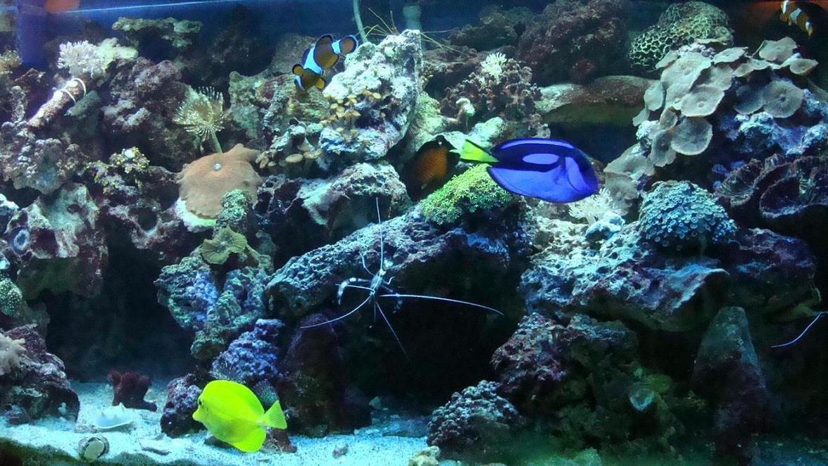 Tangs clowns damsels wrasse cat shark, coral beauty , Cleaner shrimp, coralbanded shrimp, horseshoe crab, strawberry crab, arrow crab, Black nudibranches blue and red hermits, sand sifting star, feather dusters, plus Mexican and norman turbo snails in the reef plus a fish and liverock tank with Royal Gramma, Clown Trigger ,Tomato Clown Snowflake Eel, Fuzzy Dwarf Lion and one very brave blue devil damsel