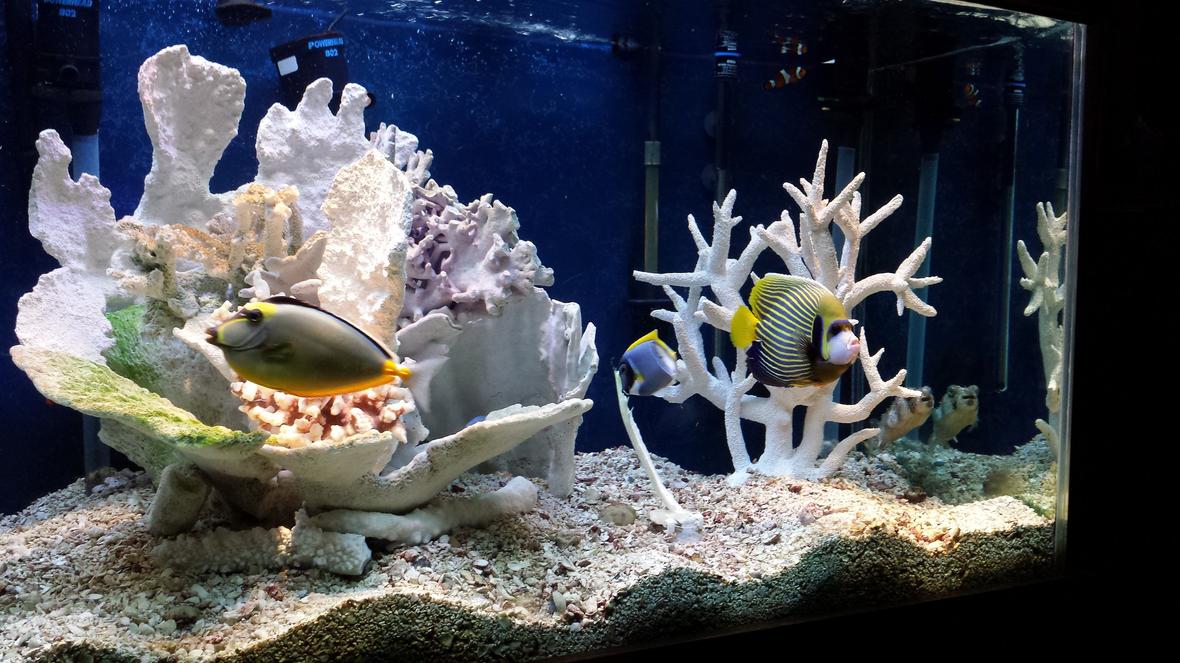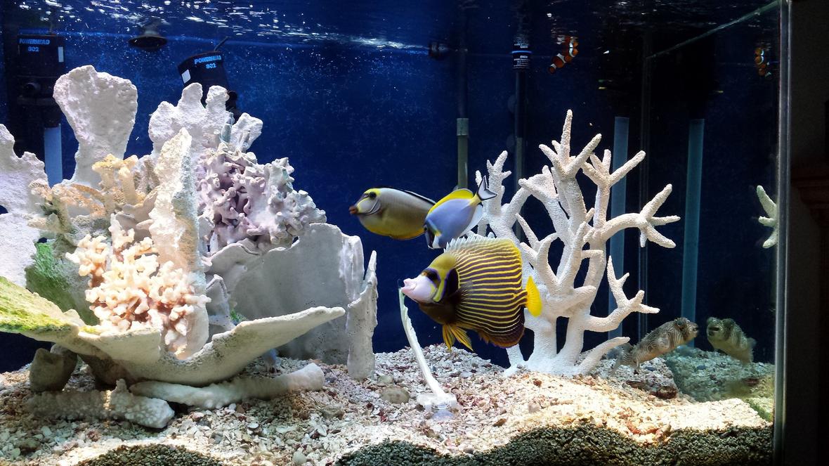 Emperor Angelfish, Naso Tang, Powder Blue Tang, Auriga Butterflyfish,Long Nose butterfly, Dragon Wrasse, Blue/Green Reef Chromis, Percula Clownfish, Tomato Clownfish, Spiny Box Puffer, Yellowtail Damselfish