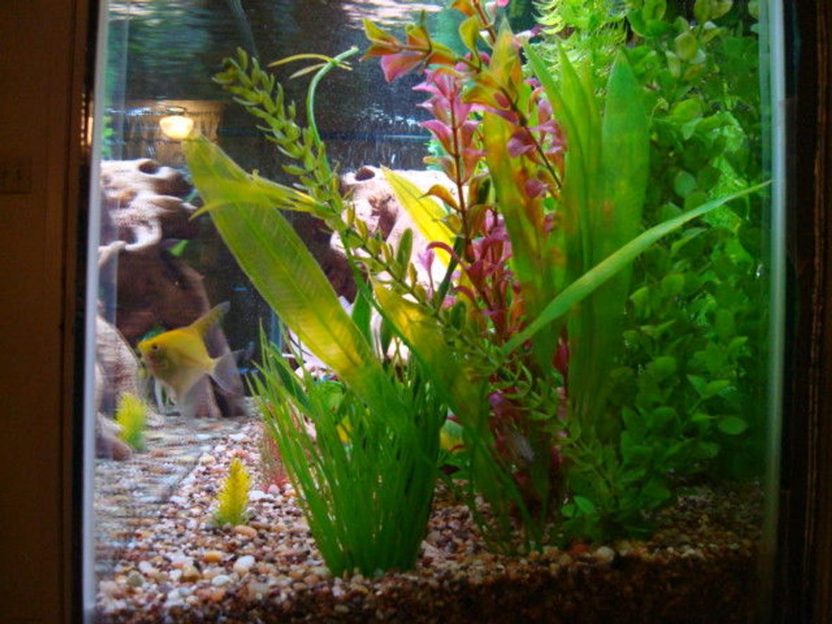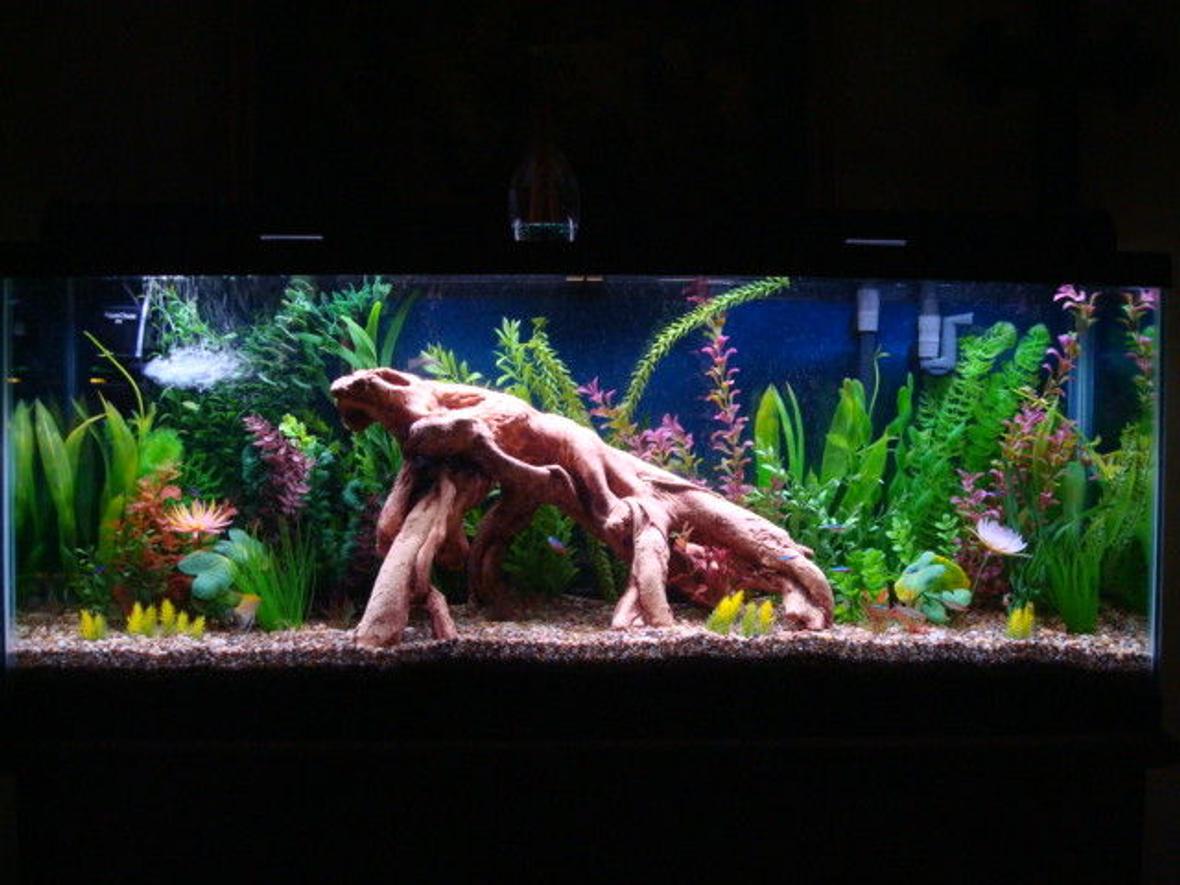 55 Gallon freshwater tank with artificial plants. Tank maintained with Fluval 305 canister filter, AquaClear Powerhead 50, undergravel filter, Hydor Theo 200w heater. Lighted with 48" fluorescent 40 watt Power-Glo made by Hagen. The color spectrum of this bulb is 18000K. The gravel bed consists of a fine pebble that is used for sand blasting. Then took some of the larger natural rock and sprinkled some on top of the smaller gravel to give it a more natural textured look. See additional pics for close ups of this gravel.