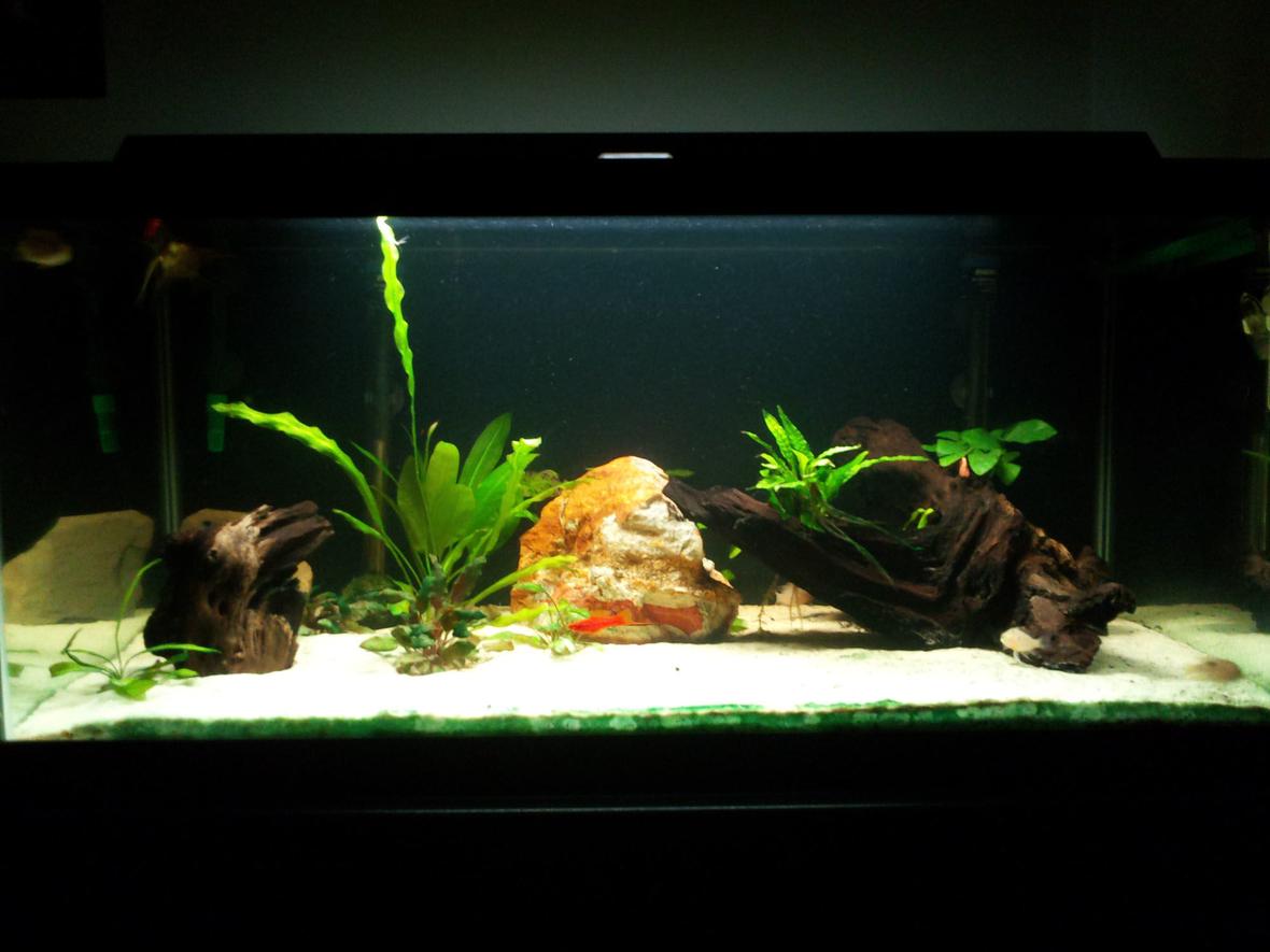 This is a 40 gallon (breeder) tank that is 36"/18"/17". With it I have an eheim 2213 classic canister filter, and two 100 watt jager heaters. I keep an 18 watt flora sun light in the hood that came with the tank. (Lighting system is temporary). All wood is real Mopani driftwood and the rock is a lava rock.