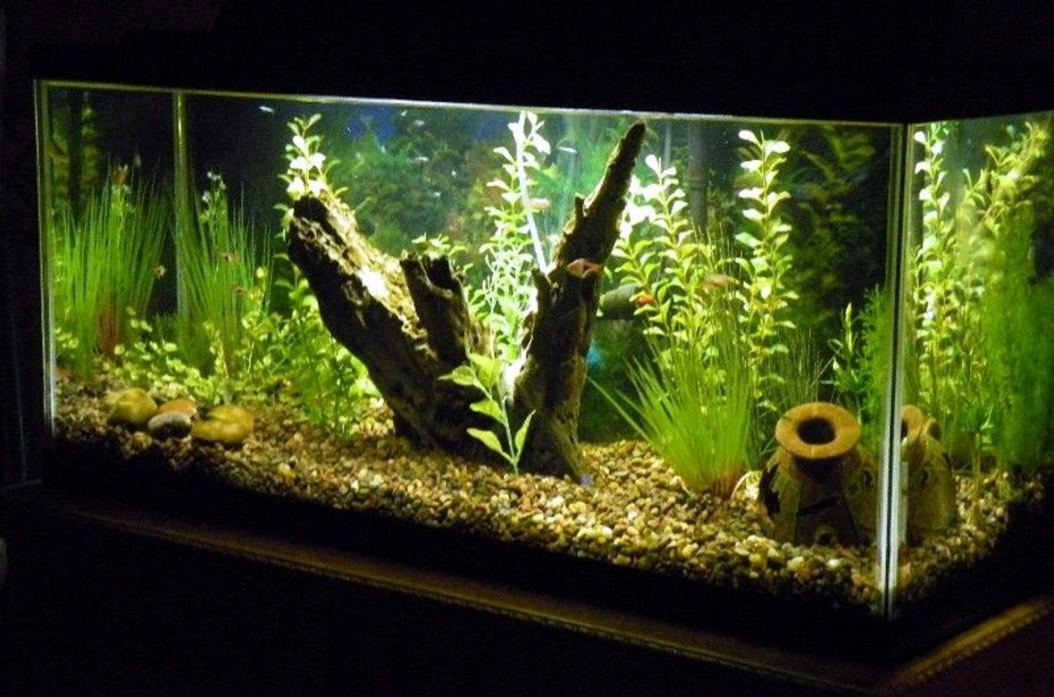 30 gallon long, 2 HOB filters, fake plants and a piece of driftwood for the pleco.