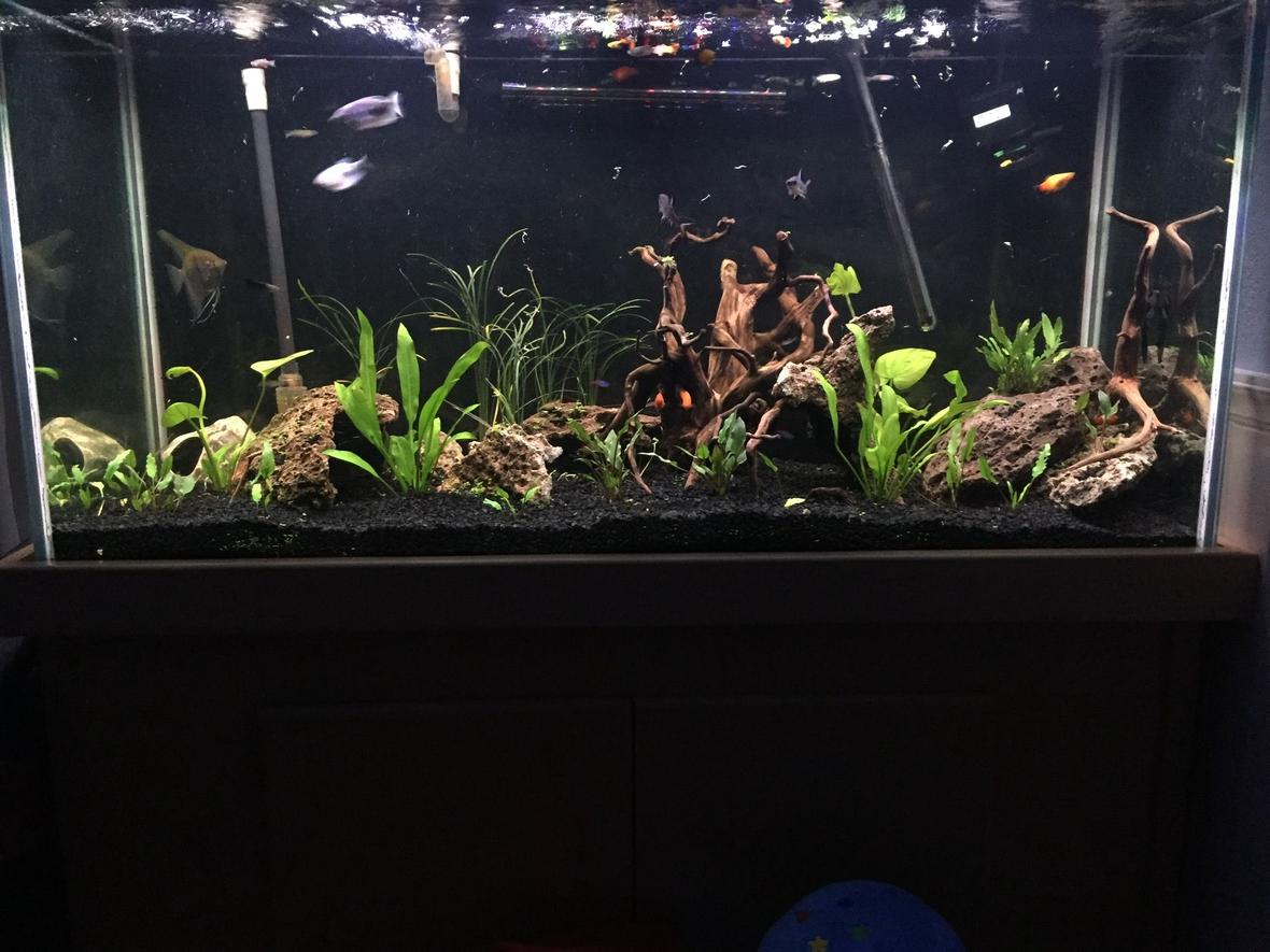 90 Gallon freshwater with custom cabinet, led lighting red white and blue Black gravel all live plants