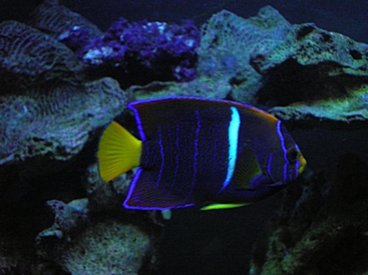125 gallon: Passer Angel, Harlequin Tusk, Garibaldi, Yellow Dottyback, Emperor Snapper, Blueline Trigger. 7 gallon: Two Elongated Pseudochromis, Green Banded Goby, White Ray Goby