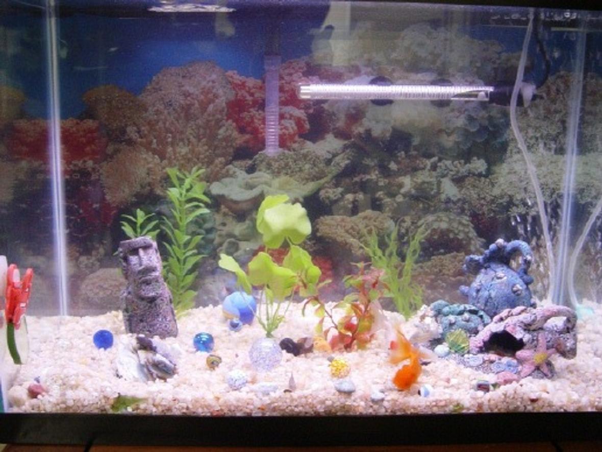 Orange Oranda, Red Cap Oranda, Pearlscale Oranda, Pleco, 3 albino corydoras, 2 green corydoras.