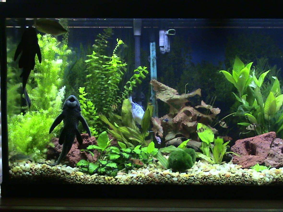 2 regular plecos, 1 rubber lip pleco, 5 tiger barbs, 3 green tiger barbs, 2 red barbs, one blue Gourami , 1 australian rainbow fish, 2 bottom feeder cat fish.