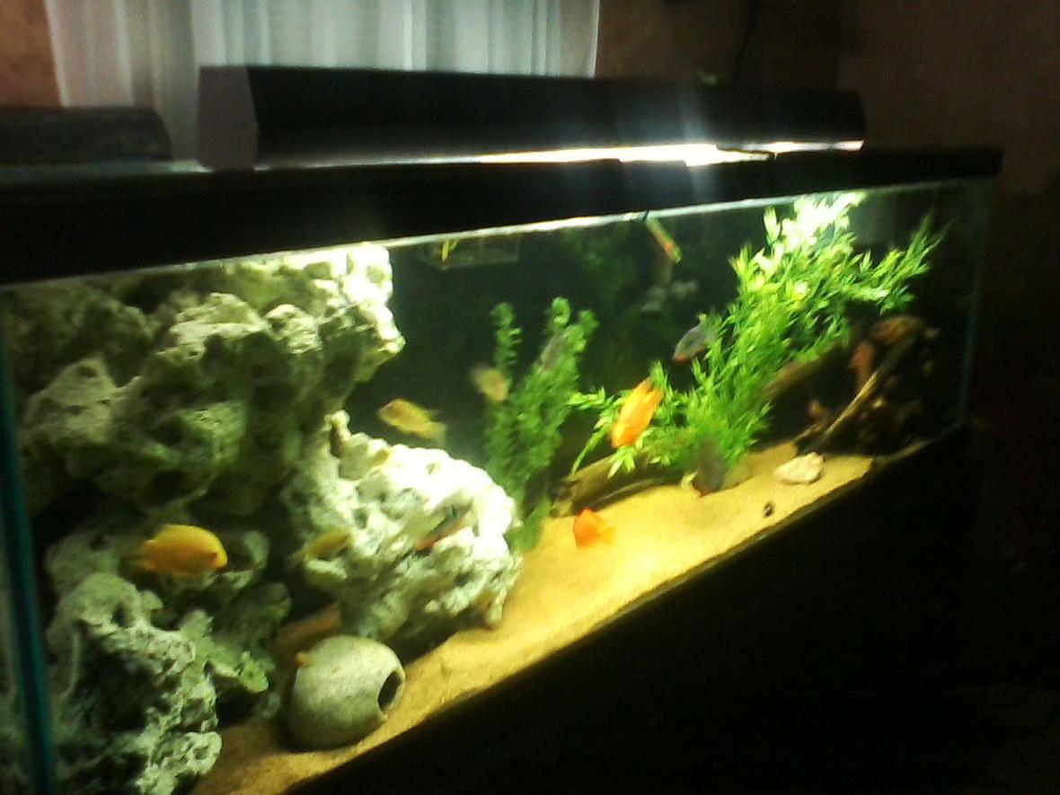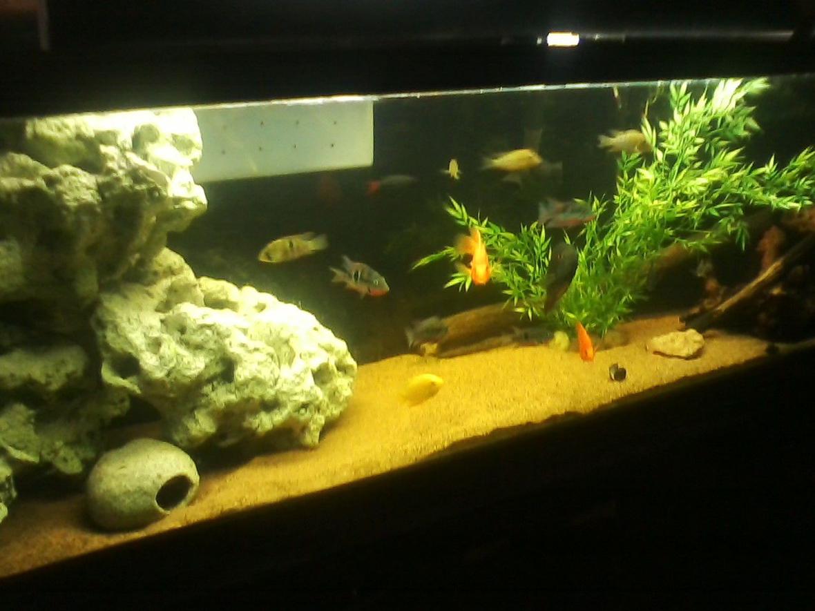 135 gallon" 72" long "18"wide "24" high fluval fx5, aqueon 400 heater eheim jaguar 300 watt drilled box with golden pothos quickrete sand african drift wood with lake drift wood. The big rocks are fake but look good and provide hiding places.The rocks are from petsmart called craggy sea rock.AND 2 fake plants