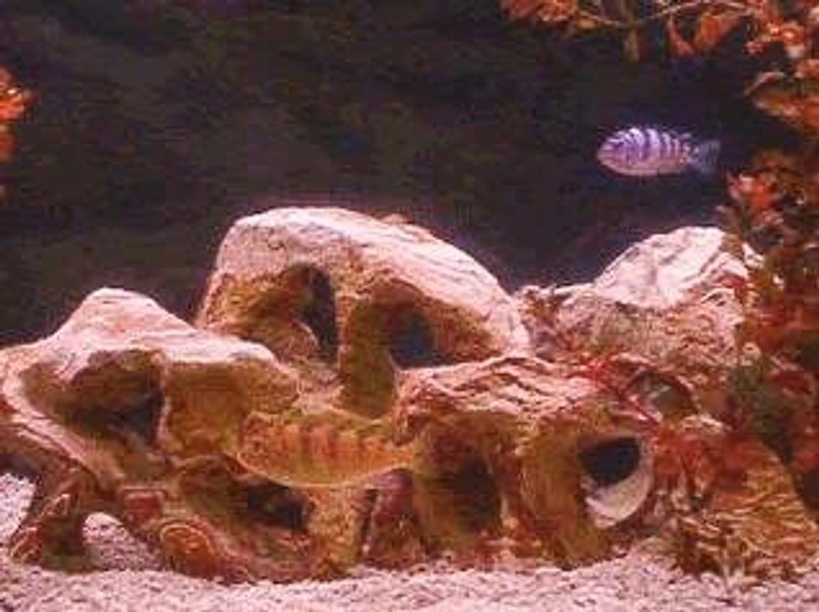 PetsMart 55 gallon aquarium, crushed white coral for substrate, African cichlids: Kenyi male and female, Red Zebra, and an Electric Yellow, unique holey rocks and fake red plants with blue lighting, Filtration is a Marineland Dual Bio Wheel
