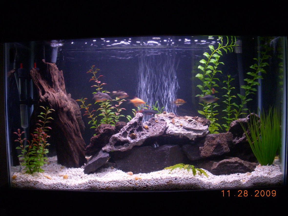29g glass tank with black stand and canopy, older fluval 204 canister filter..