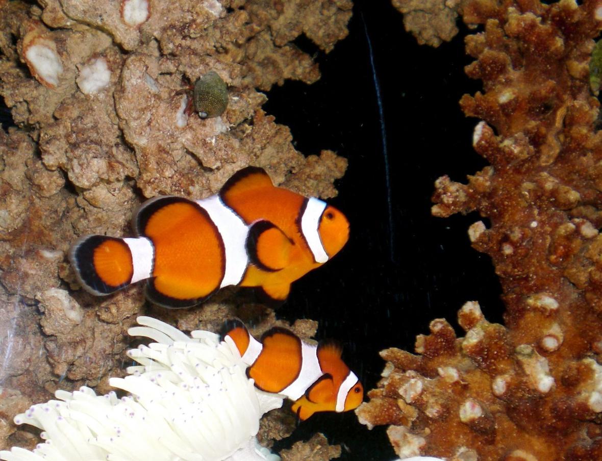 A pair of percula clowns, a purple tang, a blue linkia starfish, a red fire shrimp, a coral banded shrimp, a midas blenny, a japanese borbonious, and a Valencia Goby.
