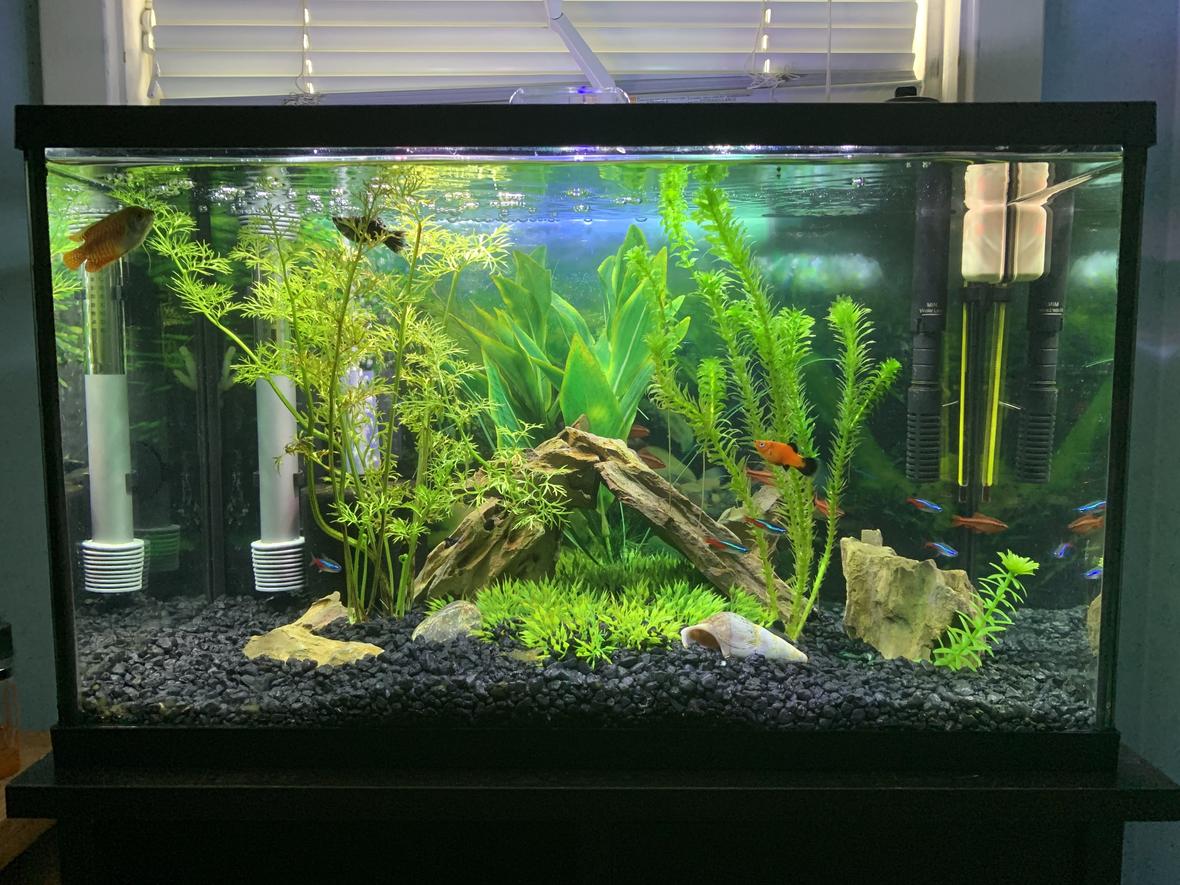 The brand of my tank is top fin, modified with a glass cover and a LED strip bar light for my plants. I use the basic 10 gallon hang on the back filter that came with the setup supplemented with a sponge filter to deal with extra bio load.