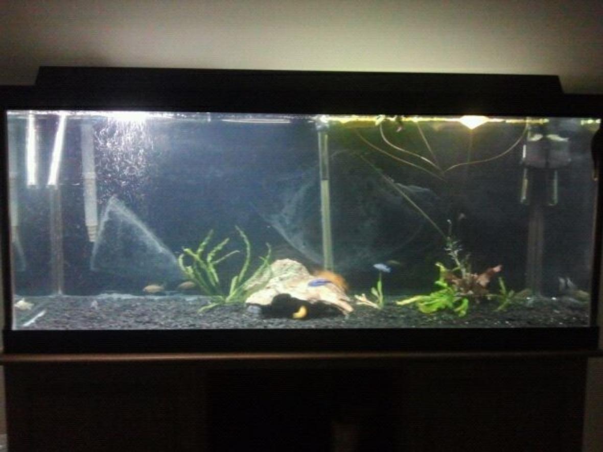 75 gallon mixed cichlid tank with lace rock and artificial plants all on black gravel, T5 lighting and dual hob filters