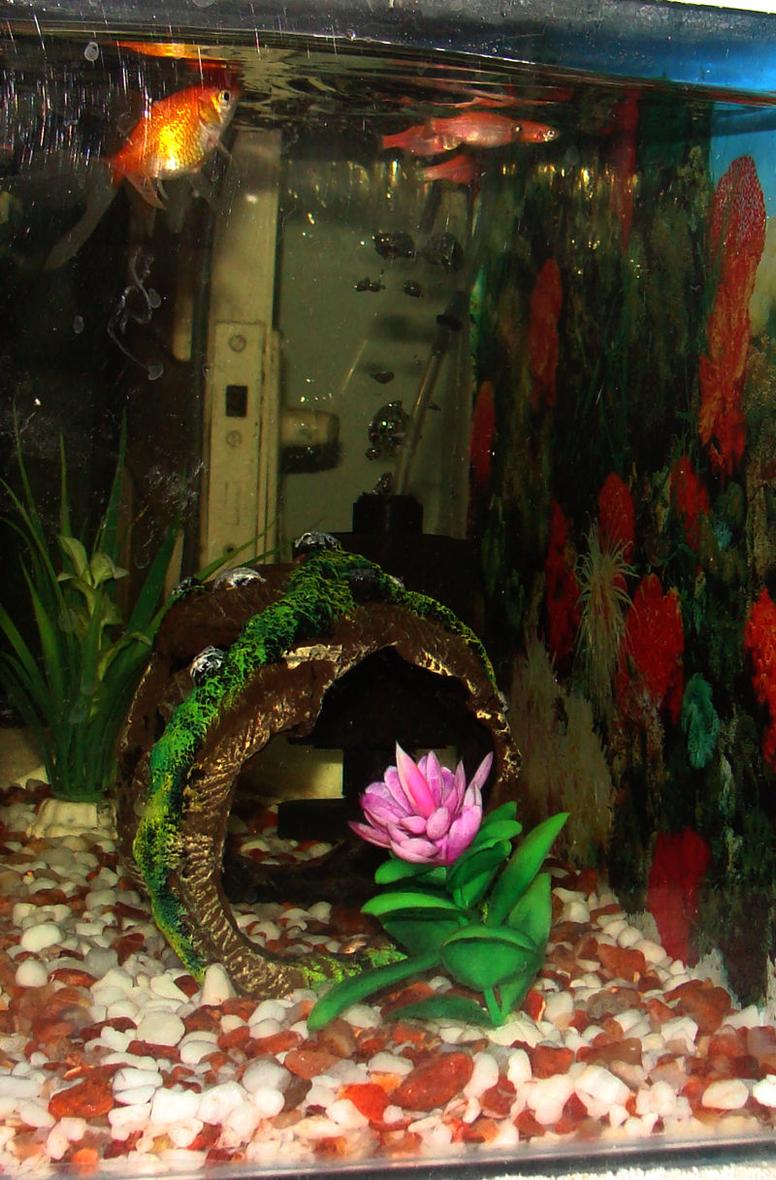 Fishes kept are two fantain goldfish and beautiful pink glow fishes.
