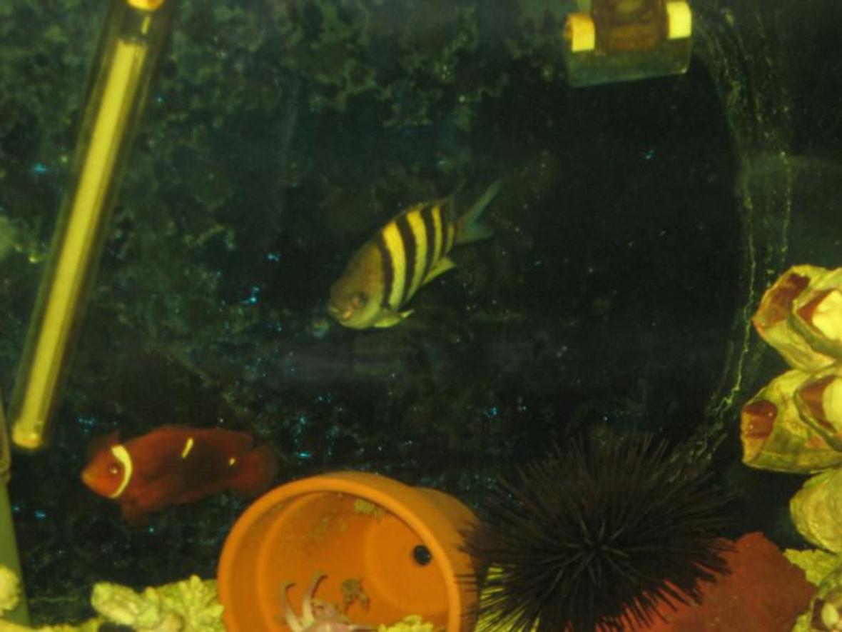 Blue Angelfish, Powder Blue Tang, Maroon Clownfish, Yellow Watchman Goby, Yellowtail Damselfish, Four Stripe Damselfish, Short spine purple sea urchin, a jaw fish
