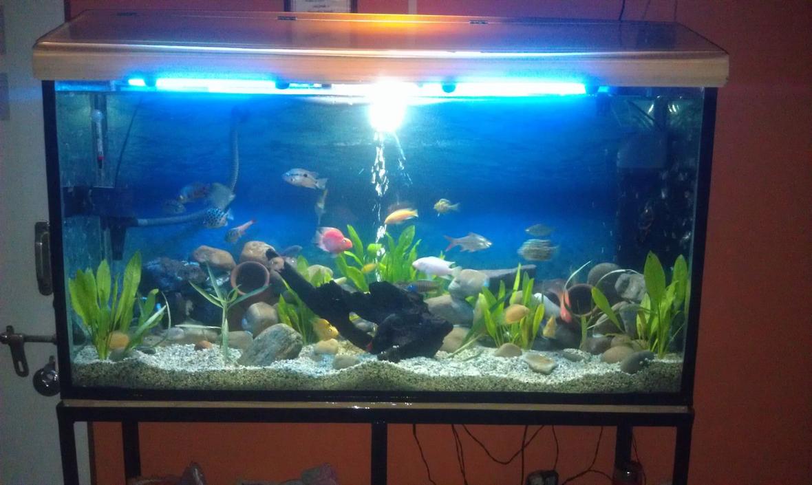 4 feet long and 2 feet in height ], 1 top filter and 1 submersible filter, 1 heater 300W, Coral sand, Rocks.