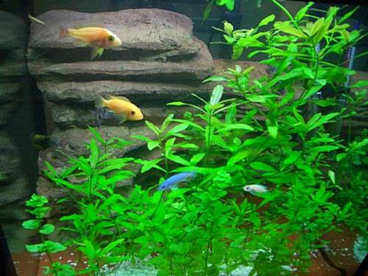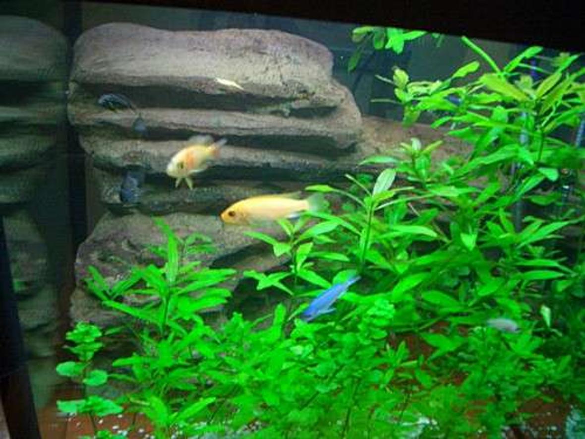 3ft x 3ft cube shape tank. Tank consists of an array of Lake Malawi and Lake Tanganyika cichlids. In addition a few pleco's. Have added a few plants for the fish (who are quite young currently)to play and swim around. The background is a rocky display which has the pleco's very happy hiding in and around the crevases.