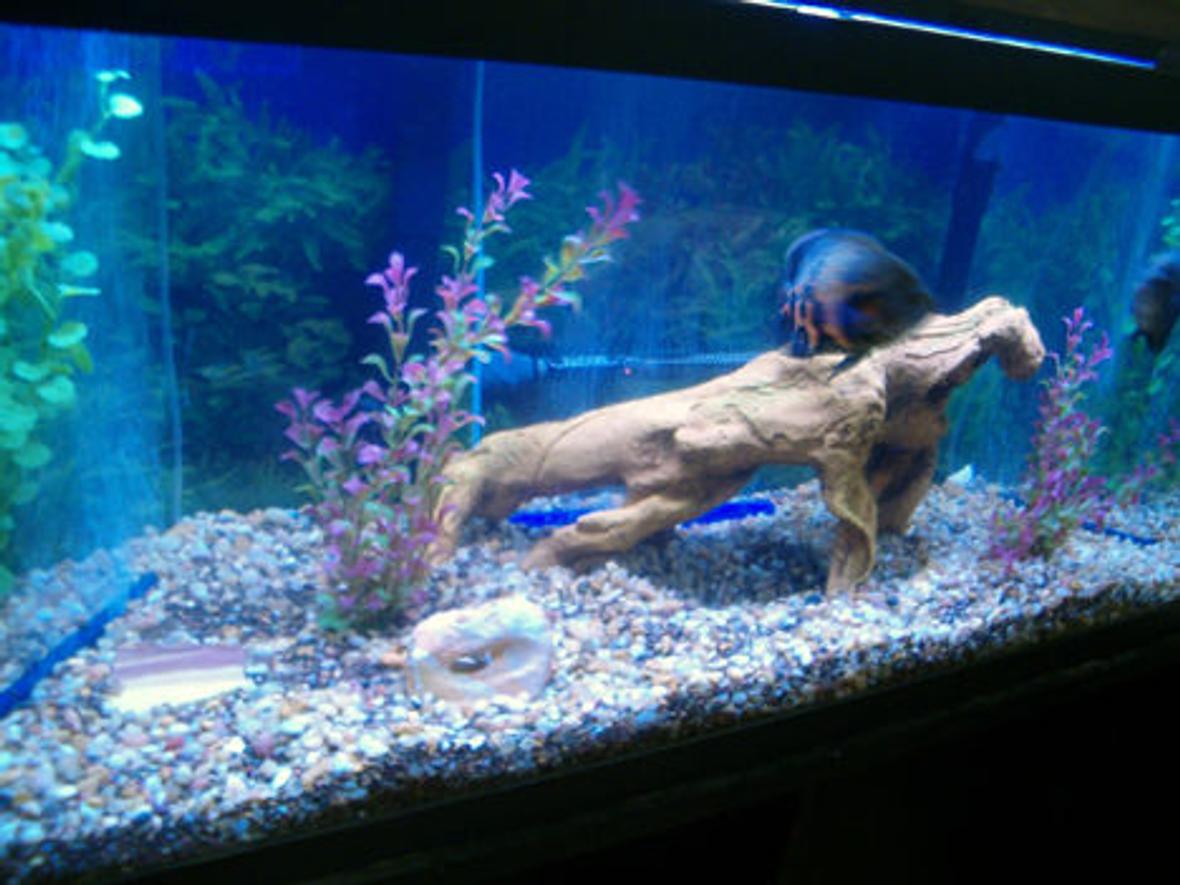 40 gal tank , sand stone , fake plants , blue gravel (for now) whisper 30-60 filter 150 W heater air stone and air pump.