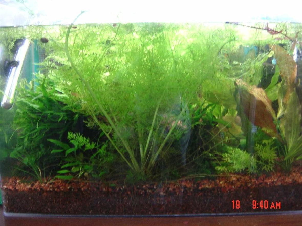 I call my plant tank, little greeny, because of the over growth of java moss in it. (I like it full of green, but no algae allowed!) My tank is a 25 gallon TruVue acrylic tank. Dimensions are 24"L x 13"W x 16"H. The lighting system is a duel compact fluorescent light from JBJ lighting with separate switches for each bulb. Bulbs used are 55watt Helios PL lamps; front is Grow Plus 8000k/7100k, back is Ultra Grow 12000k/8000k. Light needs to be on at least 10 to 12 hours a day, for adequate plant growth. I use an Extech digital light meter, after ten months of use on the bulbs, to make sure the light is always strong enough. Filtration for the tank is a Hagen Fluval 3Plus submersible filter used with ammo/carbon media. A Vortex diatom D-1 filter is used if and when an algae bloom appears. I also have a JBJ Submariner (a UV-C light filter) used as a back up to prevent diseases and bacteria blooms. Because my tank is heavily populated with plants, I use a natural dry yeast CO2 injection/diffusion system that I change every month along with the water change. The aquarium heater I use is a Marineland Visi-Therm Deluxe 75 watt heater, set to 72 degrees fahrenheit. Other equipment and products I use are; Seachem Flourite Red substrate, Coralife digital pH meter, Tetra Laborett Master Water test kit, Seachem Neutral Regulator to bring the water to 7 pH and PhosGuard for phosphate/silicate control, Seachem Flourish plant supplement, Seachem Flourish excel, organic carbon, when extra carbon is needed. Lastly a five stage reverse osmosis water filtration system is used for all the water that goes into the tank.