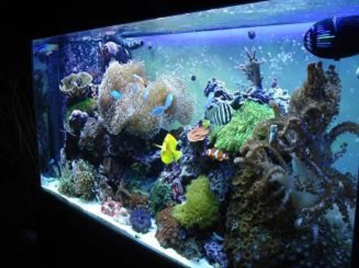 90 gal drilled all glass tank with red oak canopy and stand. Reefkeeper 1 to control lighting cycle and temp. I maintain 78.5 to 80.5 degrees year round. (2) 250wt 15K MH with (2) 110 wt VHOs. (2) Hydor Kor 1s and a MJfor in-tank criculation. A clear plastic bin with 10 gallons of water for a sump. DIY top off Mag 7 for return. Berlin classic skimmer. 200 micron filter sock cleaned every 3 days. I run Black diamond carbon changed monthly. Kent EE, reef calc, iodide, stront & molyd. added weekly rotated with an 8 gallon water change monthly as well. About 110 lbs of live rock and a 2" sandbed.