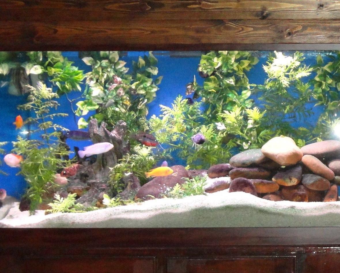Aragonite sand substrate, River rocks, Live plants. Artifical driftwood&plants.