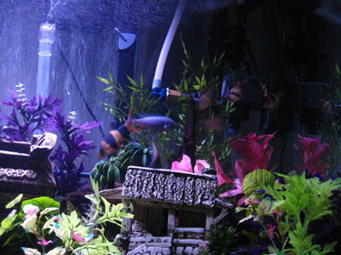 (7) Tiger barbs, (1) Bala Shark, (4) Cherry Barbs, (2) Lake Tebera Rainbows, (4) Gold Barbs, (5) Roseline Sharks, (2) Rosy Barbs, (3) malawi cichlids, (2) clown loaches, (1) zebra danios, (1) rainbow shark and 2 standard plecos