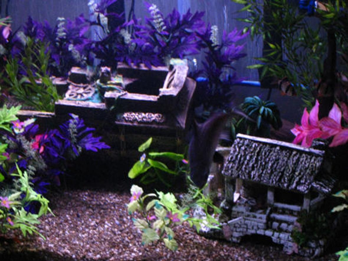 Artificial Plants - silk and plastic. Drift wood and a few large rocks.