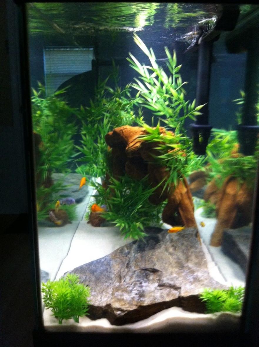 I have at the moment 9 African chilchlids( 3orange 3 blue 3 yellow) also have 2 rubber lip plecos 1 pictus catfish and 1 ralphel catfish. also have 3 snails and a hand full of ghost shrimp( which I added about 6-7 aweek to help keep waste down and also a treat for the fish) I had some 3d background I was going to use on this tank but could not get it to work with my 2 big filters. So I am saving them for my new tank.