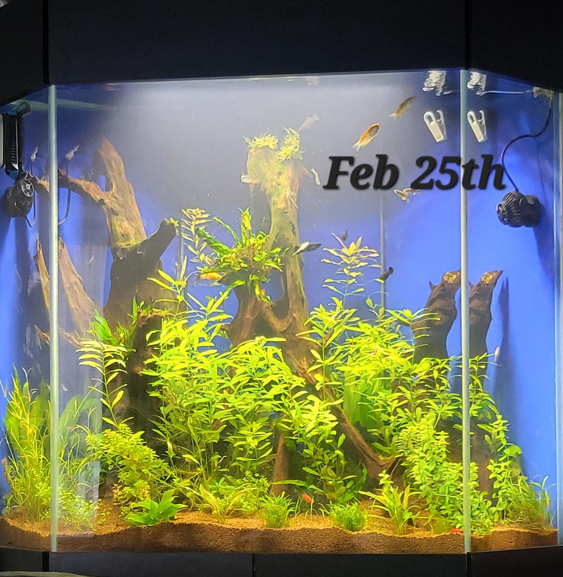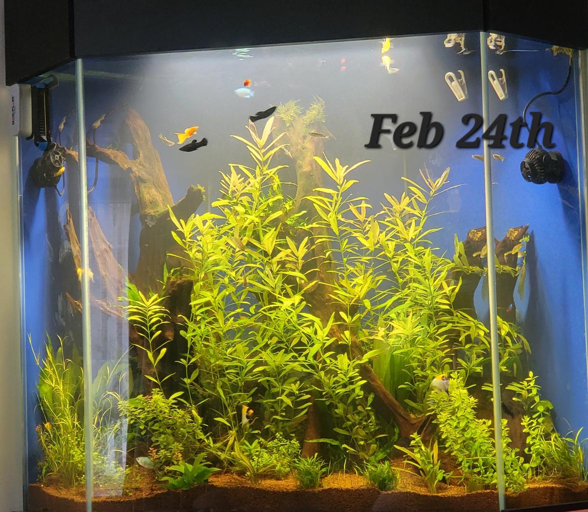 400 litre corner. 85 cm high JBL Auabasis JBL Manado Fluval fx6 filter 3 wavemakers (only one running at mo to break surace) 3 drift wood 35 plants 47 fish Set up Jan 10th 2023