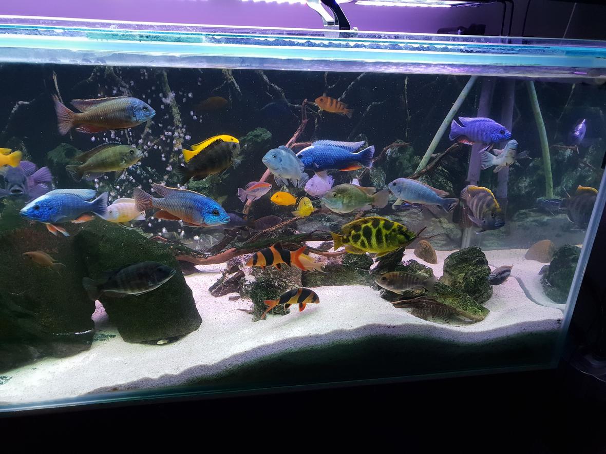 125 g mixed african cichlid tank, 2217 eheim filter, 2700 Nautilus filter UV. Several Mabuna ( crabro, acei, Hongi, zebras, arautus and maingano). Haps yellows, venustus, red fin borleyi, electric blues and red empress) alunocara (lemon jake). Non african ( chinese algea eaters which have grown to 4 inches in 2 year, 2 clown loaches which are 5 inches big in 2 years a rescue Congo tetra with has survived 3 years without any problems, 2 petricola and 2 upside cat fish which have all survived over to years. And finally 2 common bristnoses and a Golden honey pleco that have been in my take for 3 years. Blue red and white LED lighting 8 he a day feed hakari floating big balls and sinking small balls. 1 in the morning but limited to not over feed.