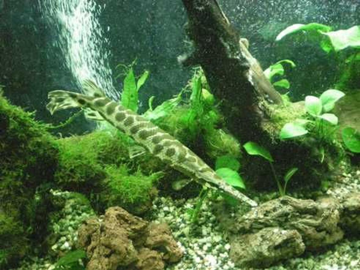 100 gal planted freshwater tank with two large powerheads running undergravel filter, two canister filters with max 275 gal combined capacity, and four 65 watt VHO flourescents run 8-10 hours per day. Soil is a mix of mediums averaging about four inches deep. There is a moderate current that provides excercise for fish and circulation for the plants.