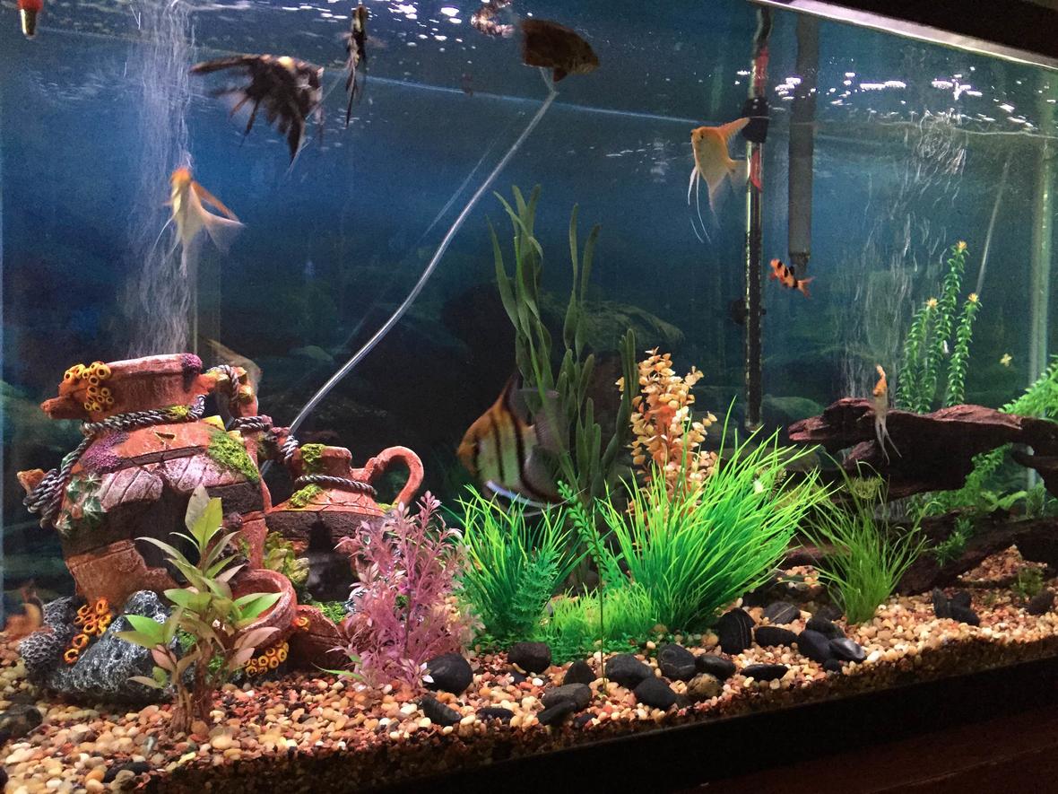 100 gallon fish tank with a few live plants, a few airstones, regular HOB filter