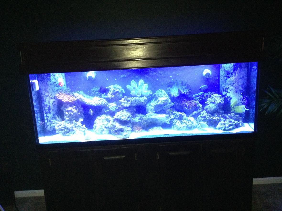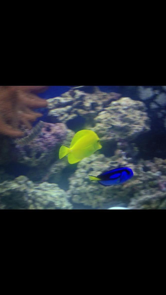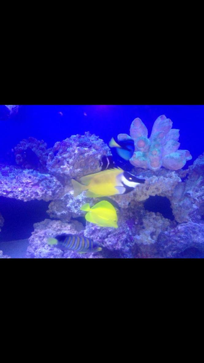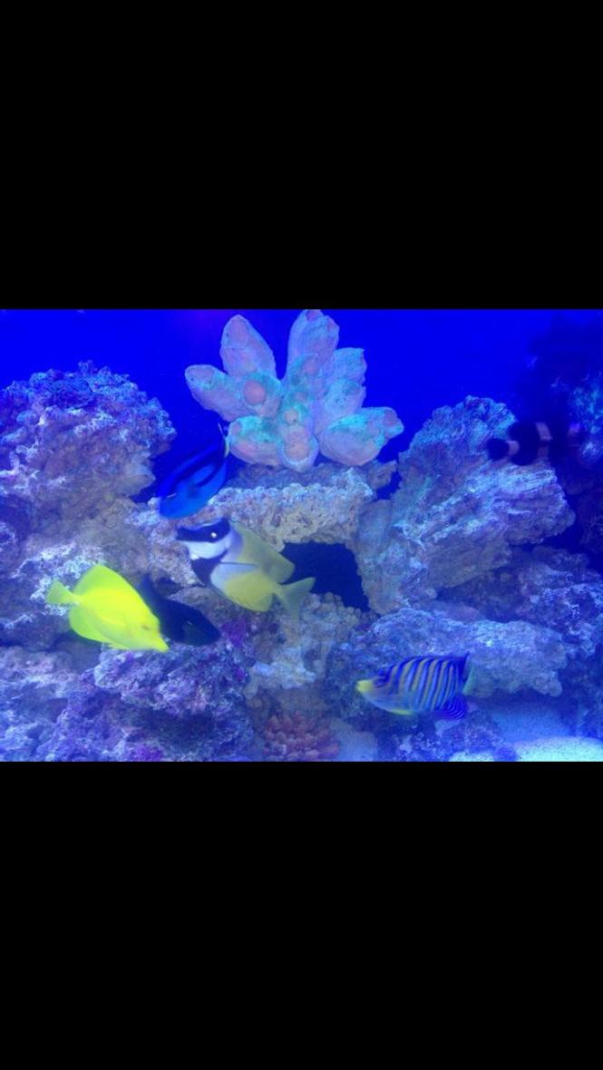 Niger Triggerfish, Blue Throat Triggerfish, Regal Angelfish, Yellow Tang - Hawaii, Blue Tang, Lawnmower Blenny, Kole Yellow Eye Tang, Foxface Lo, Maroon Clownfish, Porcupine Puffer, Snowflake Eel, Lyretail Wrasse