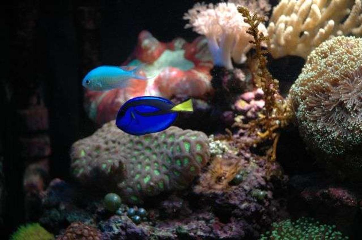 connected to a 40 galllon UniQuarium with built-in wet/dry. The 40 gallon's Wet/dry is half-filled with live rock and the other half is composed of bio balls. It is filled with more than 6 inches of sand and live rock that takes up half of the remaining space. Lighting is an Outer Orbit HQI 150watt with 2 PC's and 4 LEDs.