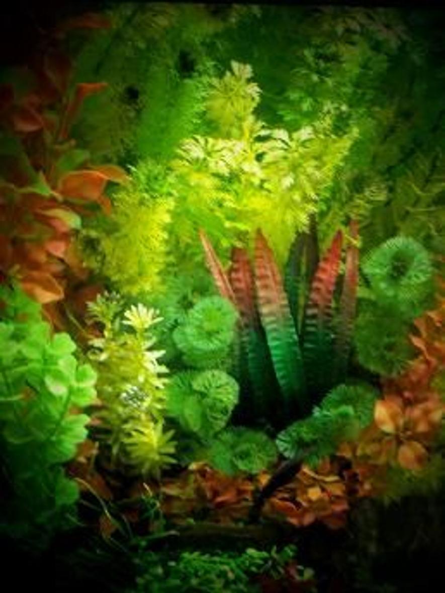 My 25 gallon tank, 12" x 24" fitted with dual-bulb lamp, Tetra Whisper Internal filter with Bio Scrubber, Tetra Whisper air pump, and bubbling airstone.