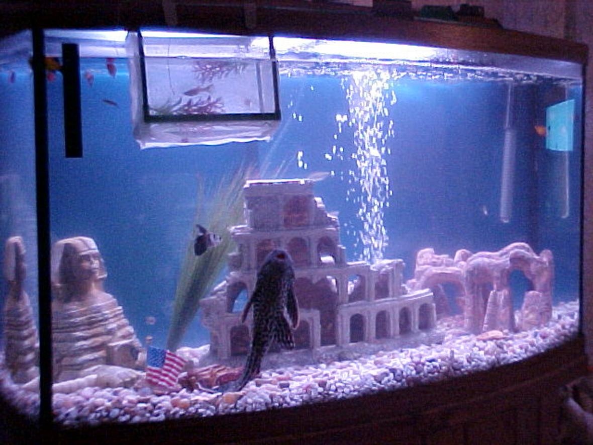 Our 46 Gallon Bow Front Tank is cleaned by a Fluval 305 filter (100 gallons / 176 liters per hour). Pebbles and stones (river) at the bottom, and a strip light in the hood.
