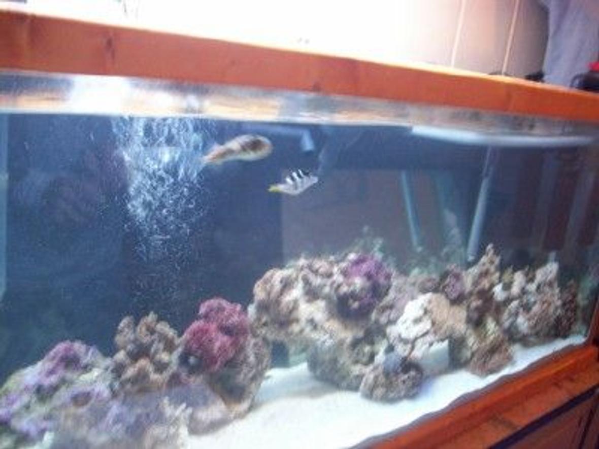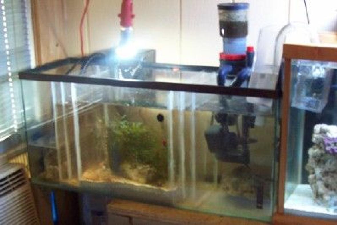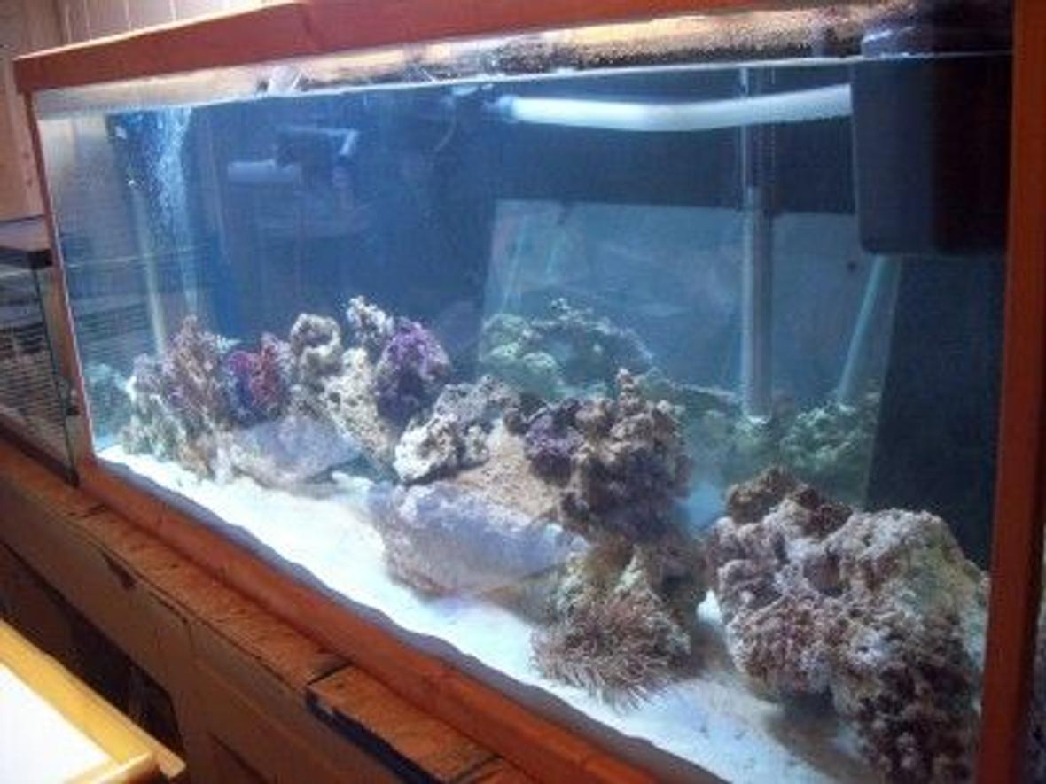 55 gallon custom made tank, 48in x 12in x 21in, Aqua clear 70 Power Head, Coralife Supper Skimmer, Green Killing Machine Internal UV sterilizer with powerhead, GLO T5HO High Output Electronic Florescent Lighting System with 1 GLO 24W 22IN Life-Glo T5 HO bulb and one GLO 24W 22IN Marine-Glo T5 HO bulb, Marineland Submersible 150W Heater, about 80 pounds of live rock. 3 blue LED lights for night vision, overflow box into 30 gallon refugium.