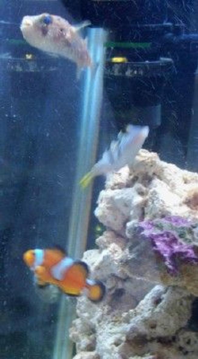 2 mis-bar clownfish, 1 peppermint shrimp, 2 blue leg hermit crabs, 2 Fire worms, 1 serpent starfish, 1 valentini puffer, 2 turbo snails, 1 long tentacle anemone, 1 conch, and 4 Pacific Nassarius Snails, 1 blue koran angelfish, 1 Niger (Red Toothed) Trigger, 1 Horseshoe crab