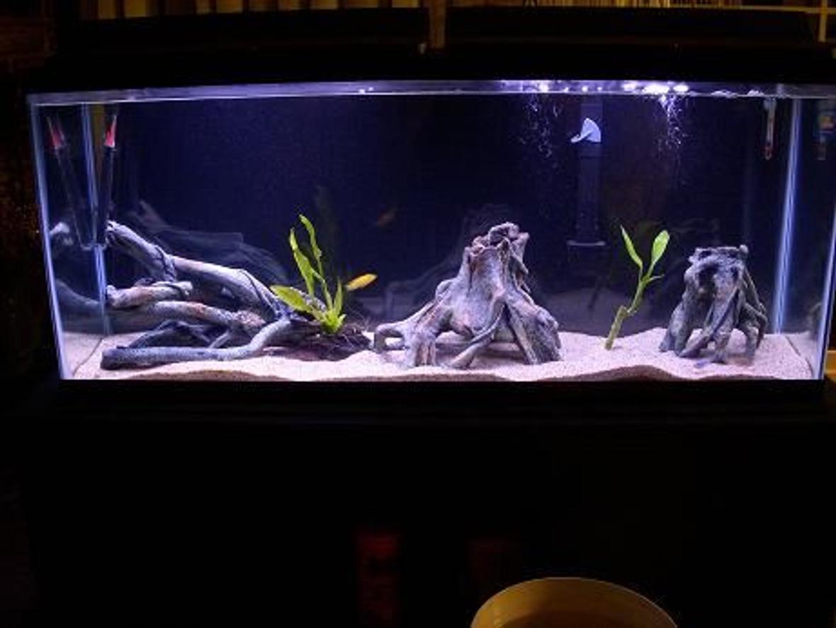 This is my first attempt at keeping cichlids. Has a black background, all-glass aquarium heater, Penguin bio-wheel 350, medium sand substance, and 3 tree root decor. I took this photo back in December I now have 2 penguin bio-wheel 350's running and a powerhead with PVC tubing to keep the bottom clean and I am planning on making it an all lava rock tank.