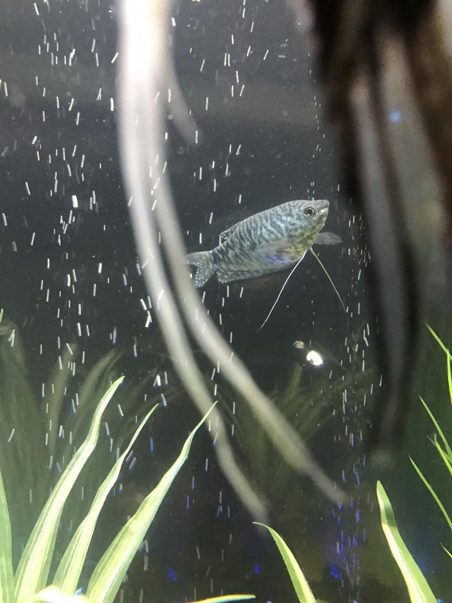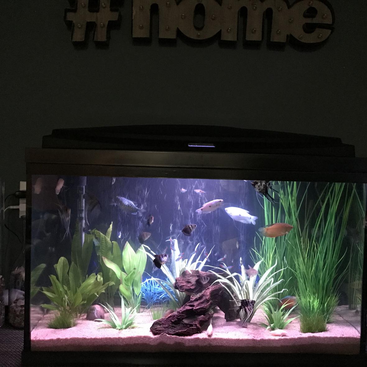 29 gallon freshwater. Partially planted; transitioning left to right with live plants. Sand substrate. Gourami, dwarf gourami, veil angels, neons, black skirt tetra, Cory cats, pleco, harlequin tetra. Bubble wall along the back. LED lighting. Rate my tank please; would love feedback.
