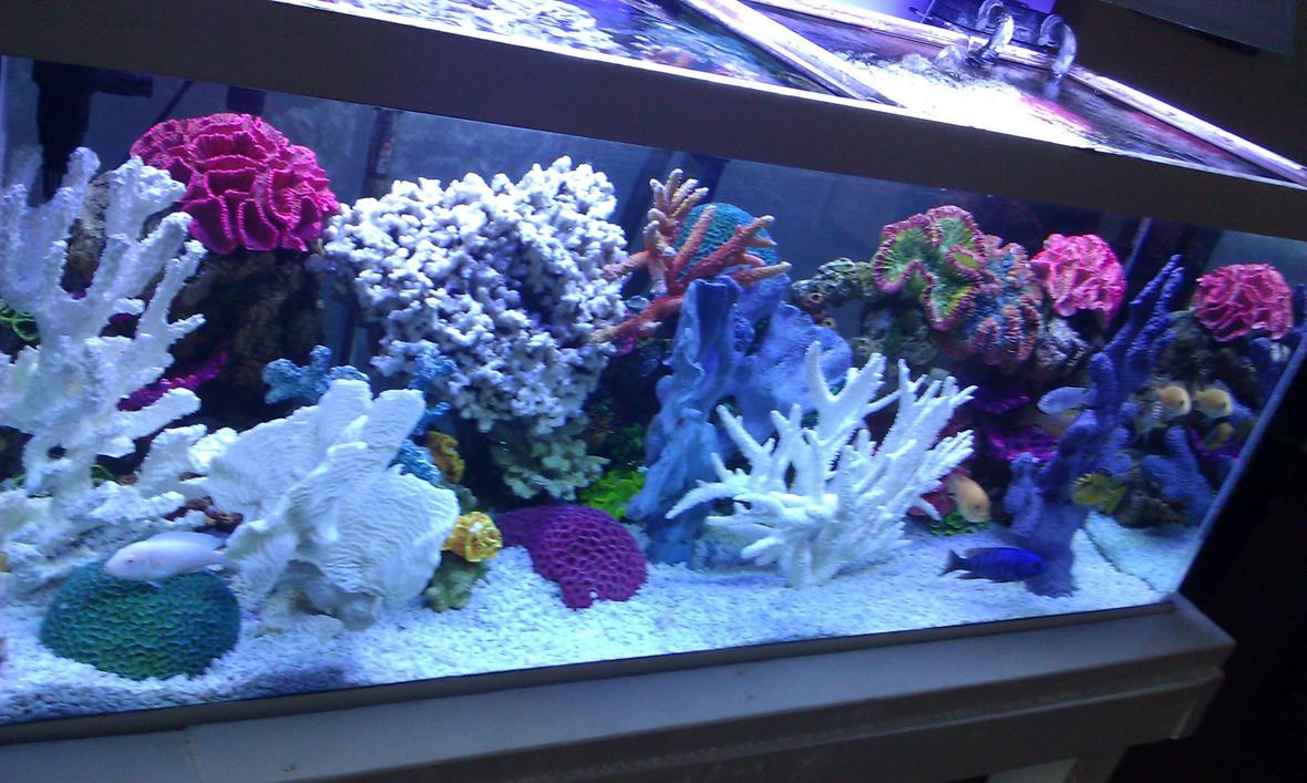 Here is one of our 75 gallon freshwater African Cichlid tanks completed in a saltwater theme. Filtration, Filtration, Filtration! On this tank we have a Magnum canister filter, Emp, and a Magnum 350. A clean tank is a happy tank.