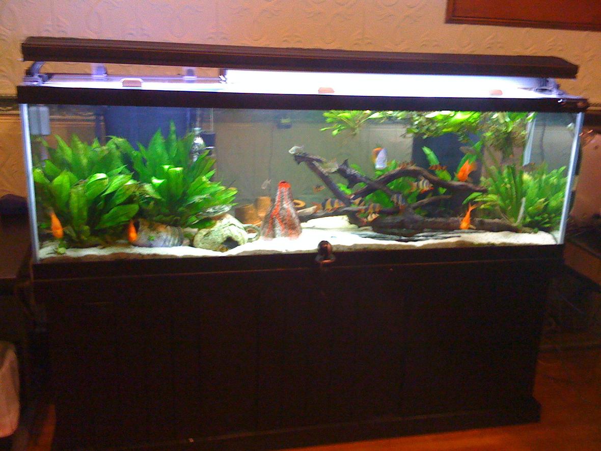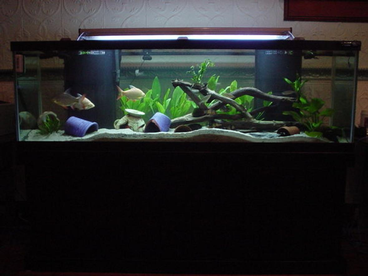 All Glass 125 Mega-Flow, Under tank sump, Peat under pool sand substrate, Coralife Compact Fluorescent 48 inch lights. Planted with large driftwood. CO2 Injection.