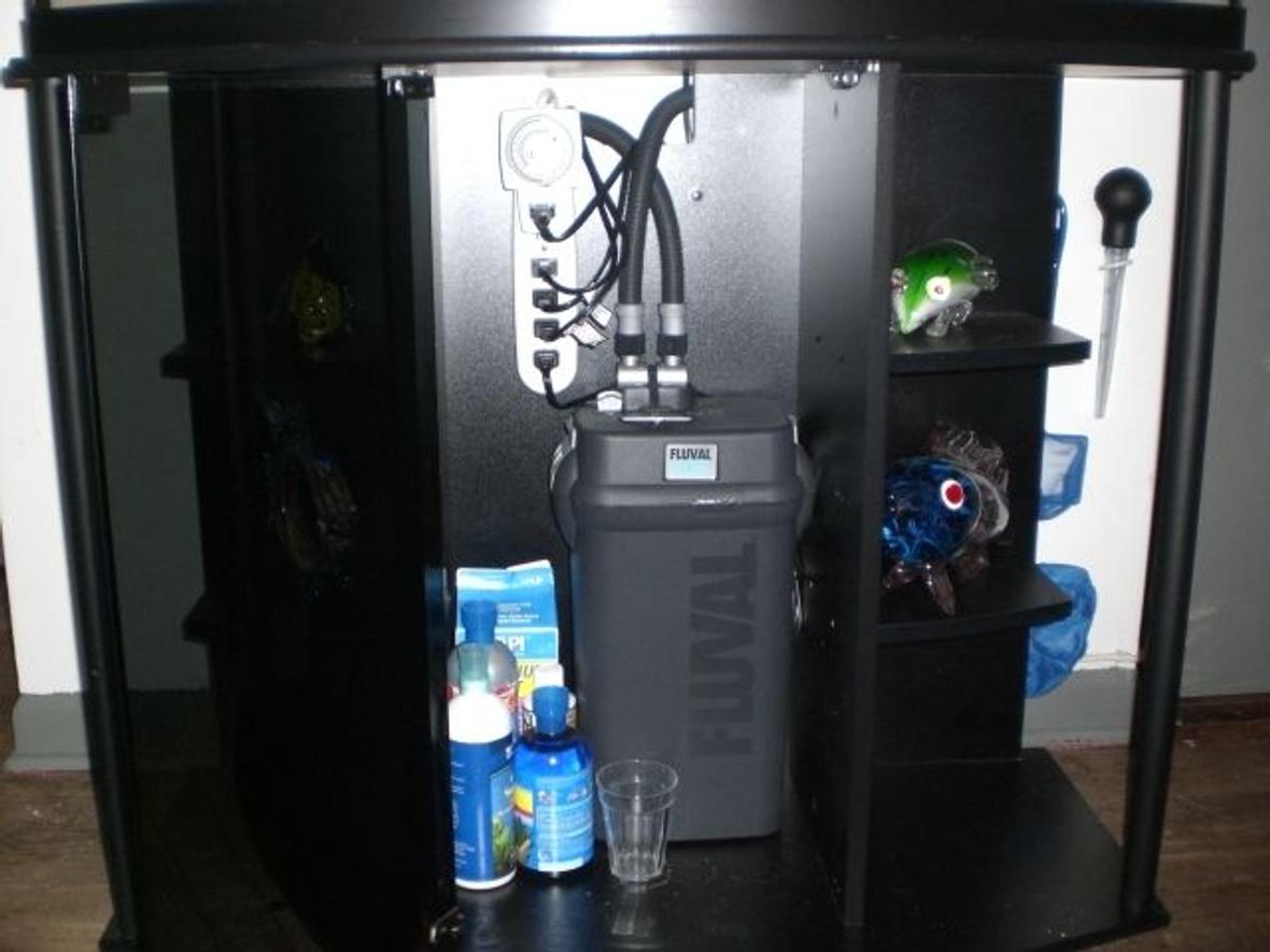 I have a 46 gallon bow front fish tank. Using rainbow rock and mopani wood for decor. I have a Fluval 405 canister filter for filtration. Aqueon 150 for my heater. I just replaced my air pump with a penguin 550 and 1150 powerhead. I learned powerheads are better than an air pump for oxygenation and water movement. Im using white silica sand instead of gravel.