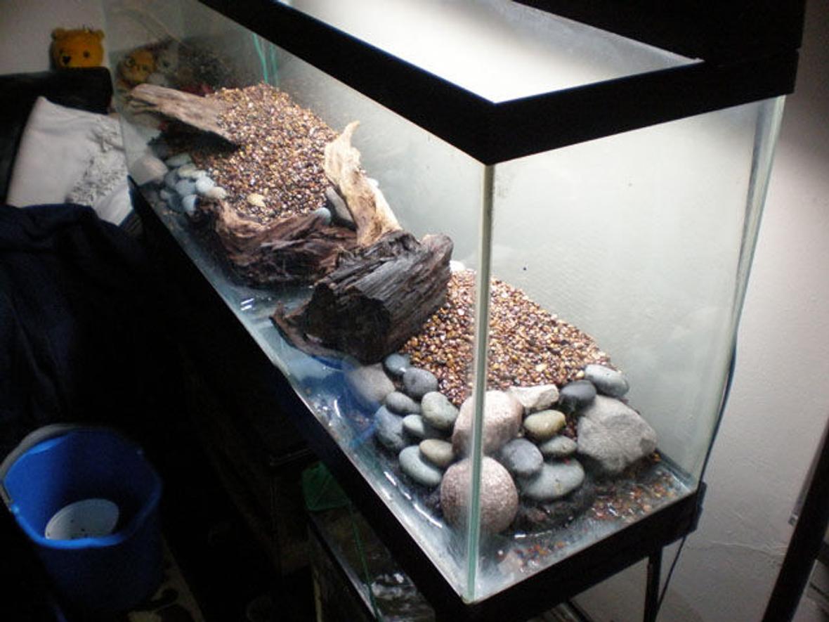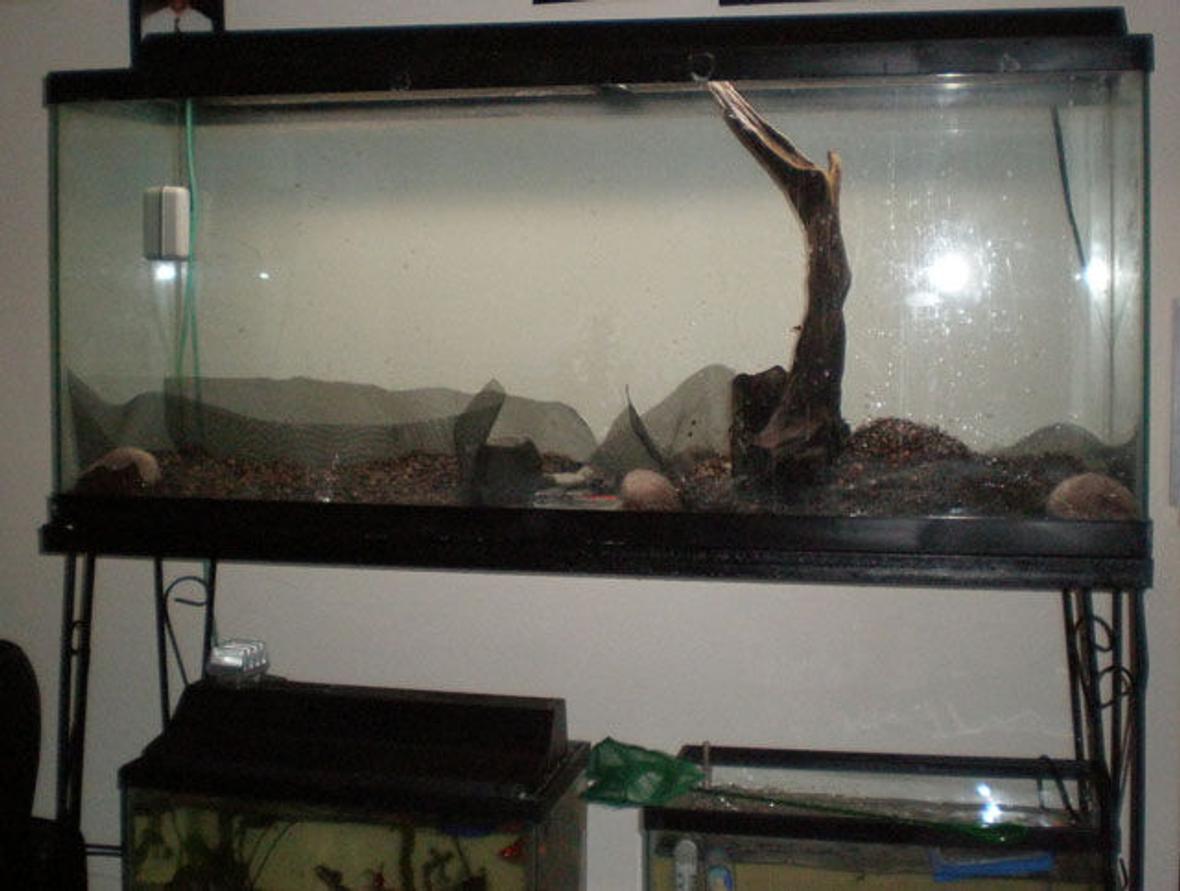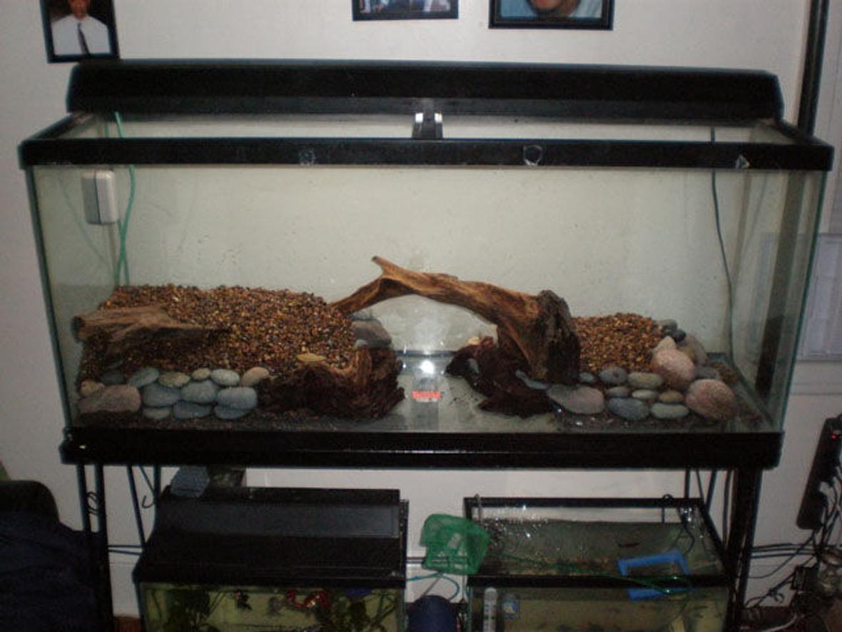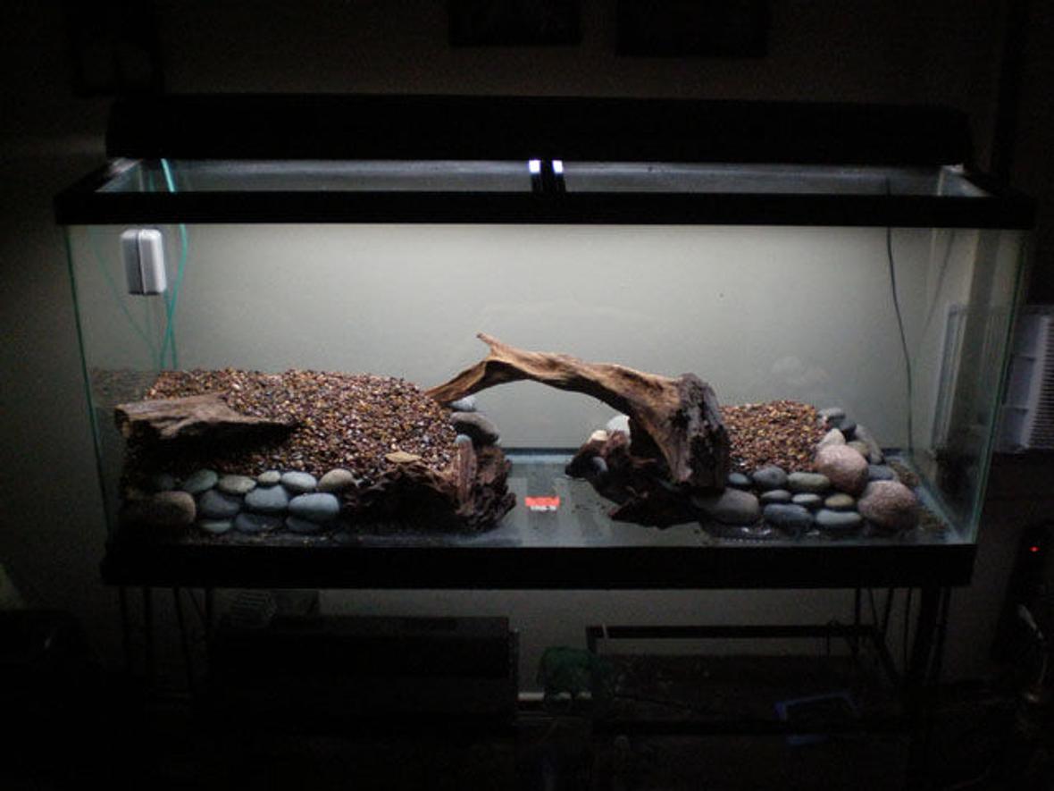 55 gal long seascaped freshwatertank. consist of 1-48" 40 watt light; 1-aquaclear 110, 1-aquaclear 30 power filter (for now)...1-300 watt aquaclear heater,1-whisper 60 bubbler,in-tank thermometer,seachem in-tank ammonia alert.no backround as of yet.